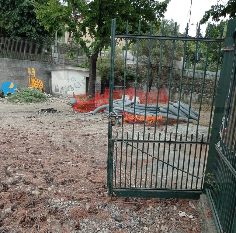 I lavori sono iniziati nel settembre scorso, con il trasferimento dei bambini in altri plessi ma, dopo un intero anno scolastico, sono praticamente fermi. Dopo l’abbattimento degli orrendi prefabbricati che per anni hanno ospitato centinaia di bimbi della materna, oggi è presente solo il terreno (spesso infangato per le piogge) e alcuni alberi sono stati abbattuti.