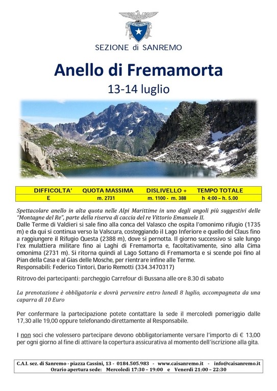 Il club alpino italiano per il fine settimana del 13-14 Luglio organizza una splendida gita ai laghi di Fremamorta in Val Gesso con pernotto al rifugio Questa con partenza in macchine condivise da Sanremo.