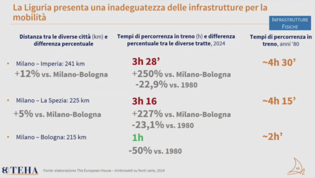 Vero è che tra la pianura Padana e la Liguria ci sono enormi differenze orografiche e di mezzo c’è un Appennino, ma è altrettanto vero che negli anni poco o nulla è stato fatto per aggiornare infrastrutture (come anche l’autostrada) rimaste praticamente identiche dalla loro nascita. Si pensi solo che ad oggi, nel 2024, si sta ancora ragionando del raddoppio della ferrovia in direzione Ponente. Ora, grazie al report Liguria 2030, ci sono anche i numeri a testimoniare la necessità di un passo avanti.