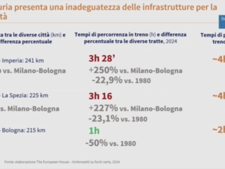 Milano e Imperia distano 241 km (+12% rispetto a Milano - Bologna), mentre tra Milano e La Spezia ci sono 225 km (+5% rispetto Milano - Bologna). Di fatto le tre tratte sono simili, le separano pochi chilometri. Ma i tempi di percorrenza sono clamorosamente diversi. In media per andare in treno da Milano a Imperia servono 3 ore e 28 minuti un notevole +250% rispetto a Milano-Bologna e, soprattutto, solo un -22,9% rispetto al 1980. Per la tratta tra Milano e La Spezia, invece, servono mediamente 3 ore e 16 minuti, +227% rispetto a Milano-Bologna e solo -23,1% rispetto al 1980. Infine, per avere un’idea di cosa significhi spostarsi in tempi coerenti con il 2024, basta prendere atto della percorrenza media tra Milano e Bologna: 60 minuti (e un -50% rispetto al 1980).