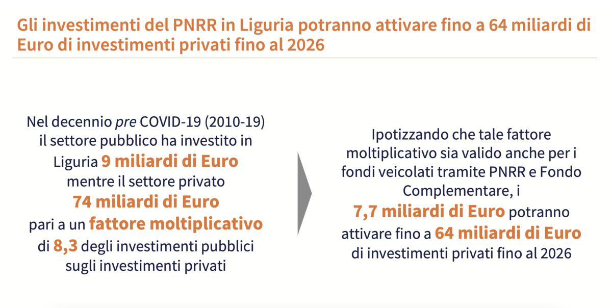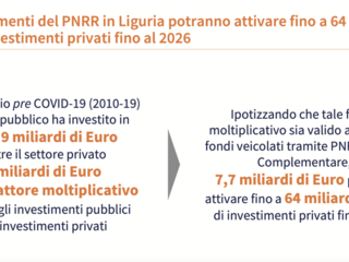 La buona notizia tra le pagine del report Liguria 2030 arriva dalla quantità di fondi privati che il PNRR potrà attivare in Liguria. Secondo lo studio di TEHA i privati potrebbero portare in Liguria 64 miliardi di euro fino al 2026. Un dato basato sul decennio pre Covid (2010-2019), quando il settore pubblico ha investito in Liguria 9 miliardi di euro mentre il privato ha portato 74 miliardi con un fattore moltiplicativo di 8,3.