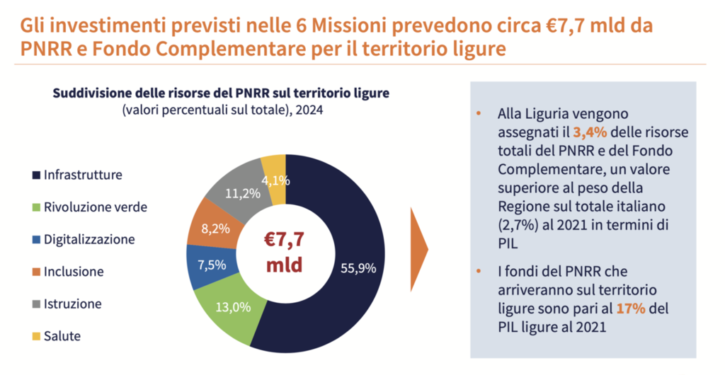Partiamo dalle basi: quanti fondi arriveranno in Liguria? Stando ai dati presentati nel report Liguria 2030, in totale sono previsti 7,7 miliardi di euro, pari al 3,4% delle risorse totali del Piano. Una cifra notevole se si pensa che la Liguria pesa il 2,7% in termini di PIL su scala nazionale.