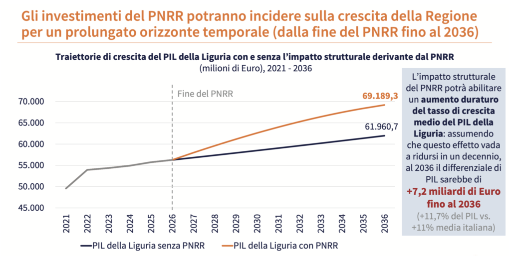 Sempre stando alle elaborazioni di TEHA, gli investimenti del PNRR potranno incidere sulla crescita della regione per un orizzonte temporale prolungato, dalla fine del PNRR fino al 2036 con un differenziale di 7,2 miliardi rispetto alle stesse proiezioni senza i fondi del Piano.