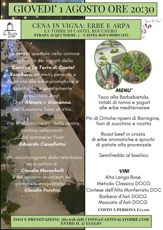 La cantina La Torre di Castel Rocchero presenta un nuovo ciclo di serate a tema, immerse nella tranquillità dei vigneti dove profumi e sapori si mescolano per creare un'esperienza unica sotto le stelle. Le serate giovedì 1 e 8 agosto con inizio alle ore 20.00 saranno animate da racconti e melodie affascinanti, promettendo emozioni in una magica e romantica atmosfera.