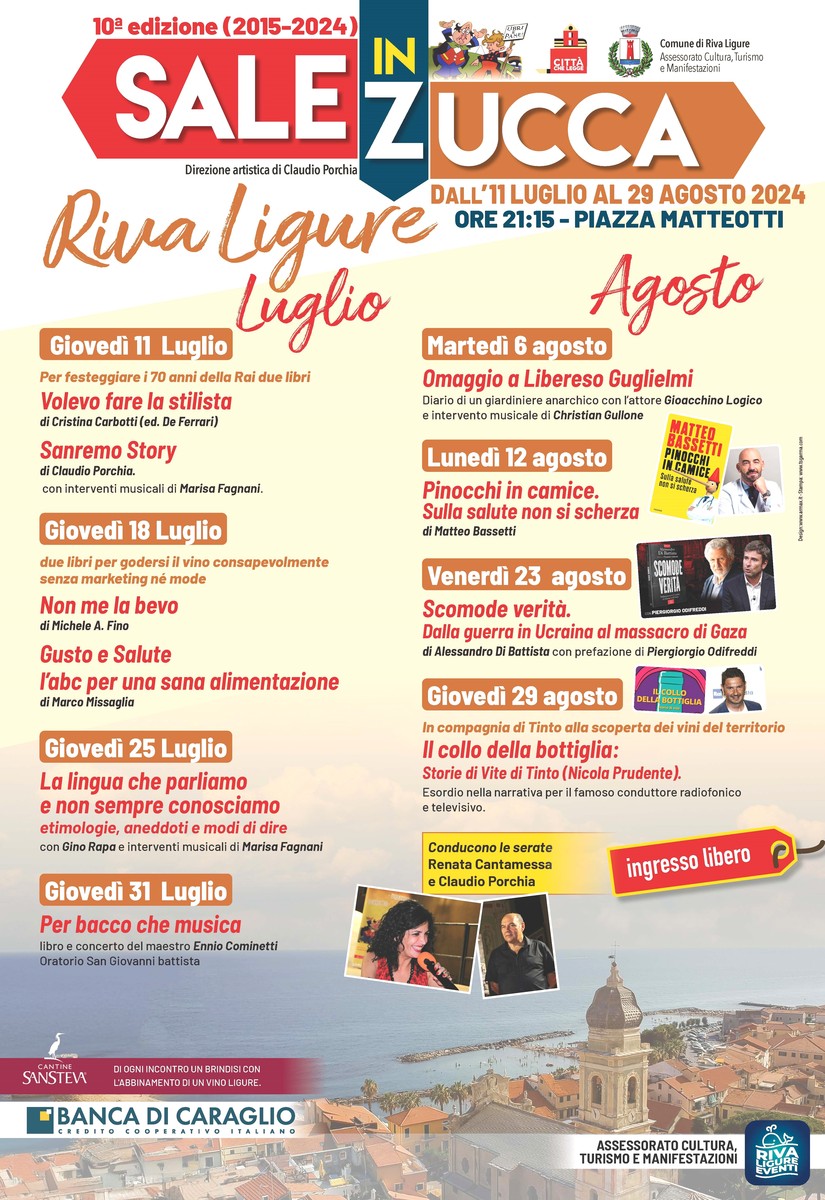 La rassegna letteraria Sale in Zucca giunta alla decima edizione vede quest’anno la doppia conduzione di Claudio Porchia e Renata Cantamessa. Gli eventi in piazza Matteotti offriranno conversazioni con personaggi importanti e autori come Matteo Bassetti, Alessandro Di Battista e Nicola Prudente, alias Tinto. In programma anche intermezzi musicali e performance teatrali, seguiti da brindisi con i vini di SanSteva.