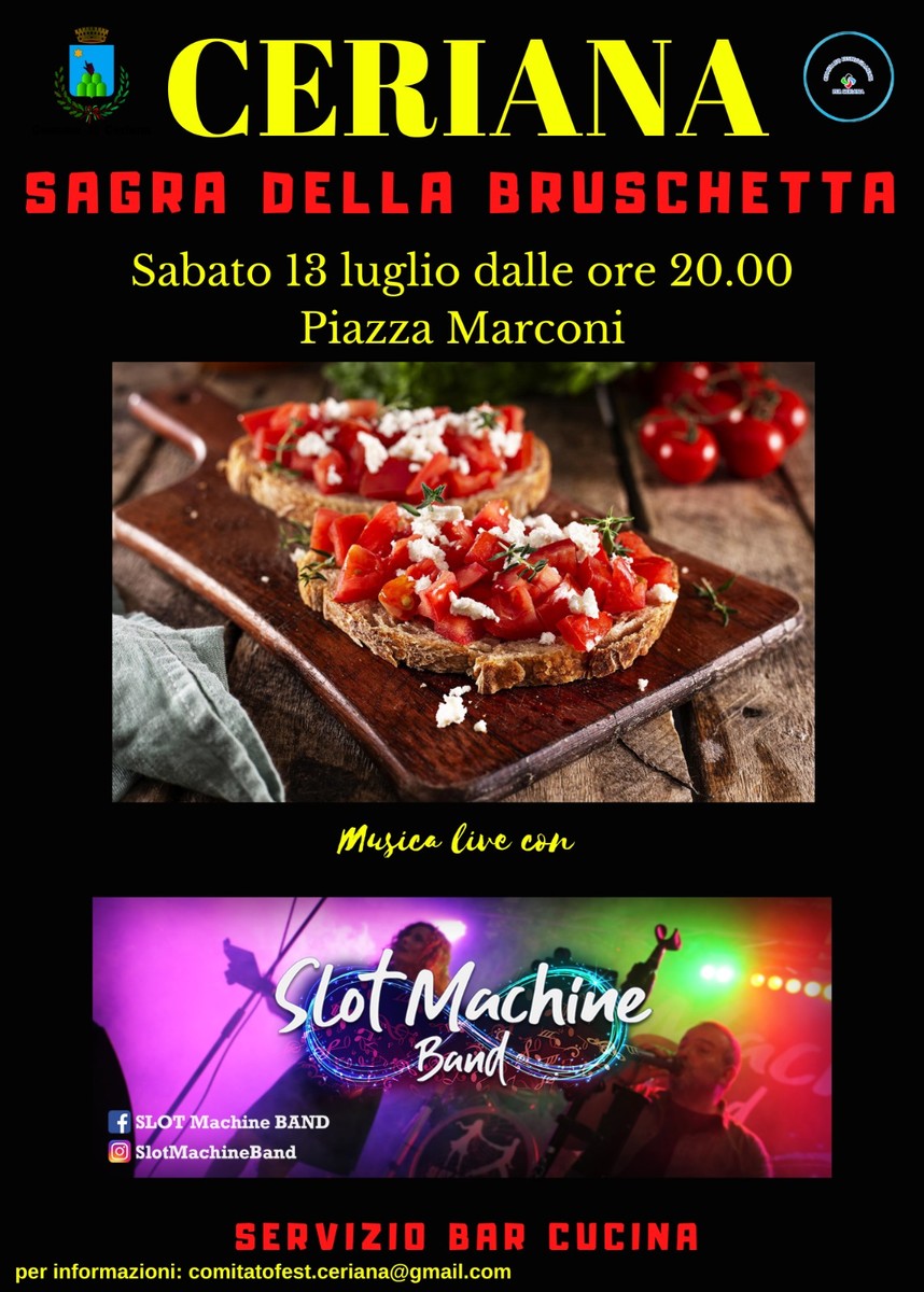 Sabato 13 luglio: Piazza Marconi si anima con la "Sagra della Bruschetta", un'occasione per gustare deliziose bruschette in compagnia di musica dal vivo con la Slot Machine Band.