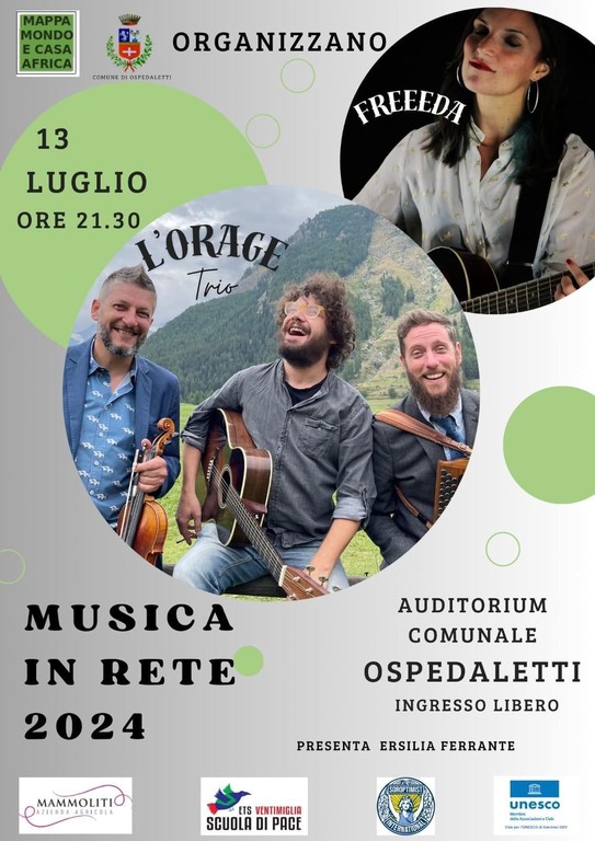 Sabato 13 luglio 2024 alle 21.30, nella cornice dell’Auditorium comunale di Ospedaletti, si terrà la terza edizione di “Musica in Rete” che rappresenta ormai da 3 anni una interessante proposta musicale culturale e all’insegna della solidarietà.