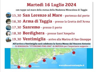 “In questo anno pastorale – si spiega nel comunicato - la Statua della Madonna Miracolosa di Taggia ha visitato tutte le parrocchie della Diocesi, in un pellegrinaggio accompagnato da momenti di preghiera e di affidamento, radunando persone di tutte le età. Questo viaggio ora si conclude con la processione sul mare che si terrà martedì 16 luglio con partenza da San Lorenzo al Mare e si concluderà a Ventimiglia gli orari riportati nella locandina in basso. Tutti i fedeli sono invitati a partecipare nelle tappe loro più comode in cui sosterà il battello che trasporterà la Statua della Madonna. Grazie all'accordo con le Capitanerie di Porto chi vorrà potrà seguire con la propria imbarcazione il percorso intero della processione in mare accodandosi. Arrivati a Ventimiglia il Vescovo Antonio Suetta celebrerà la Santa Messa presso il Porto di Cala del Forte alle ore 19.30”.