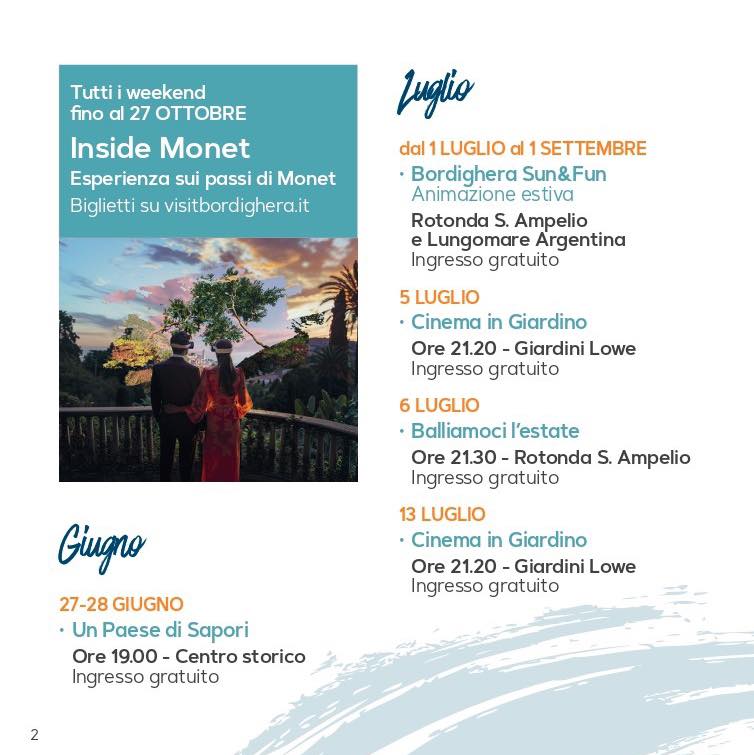 Molto apprezzata l'esperienza immersiva sui passi di Monet: 'Inside Monet'. Tante persone, inoltre, hanno preso parte alla due giorni di 'Un paese di Sapori' nel centro storico dove hanno potuto degustare prelibati piatti ascoltando musica dal vivo. L'animazione estiva 'Bordighera Sun&Fun' ha divertito e intrattenuto cittadini e turisti e continuerà a farlo fino al 1 settembre. Approvato anche il primo appuntamento del 'Cinema in giardino' andato in scena ai giardini Lowe. In tanti si sono, infine, ritrovati alla rotonda di Sant'Ampelio per 'Balliamoci l'estate'.