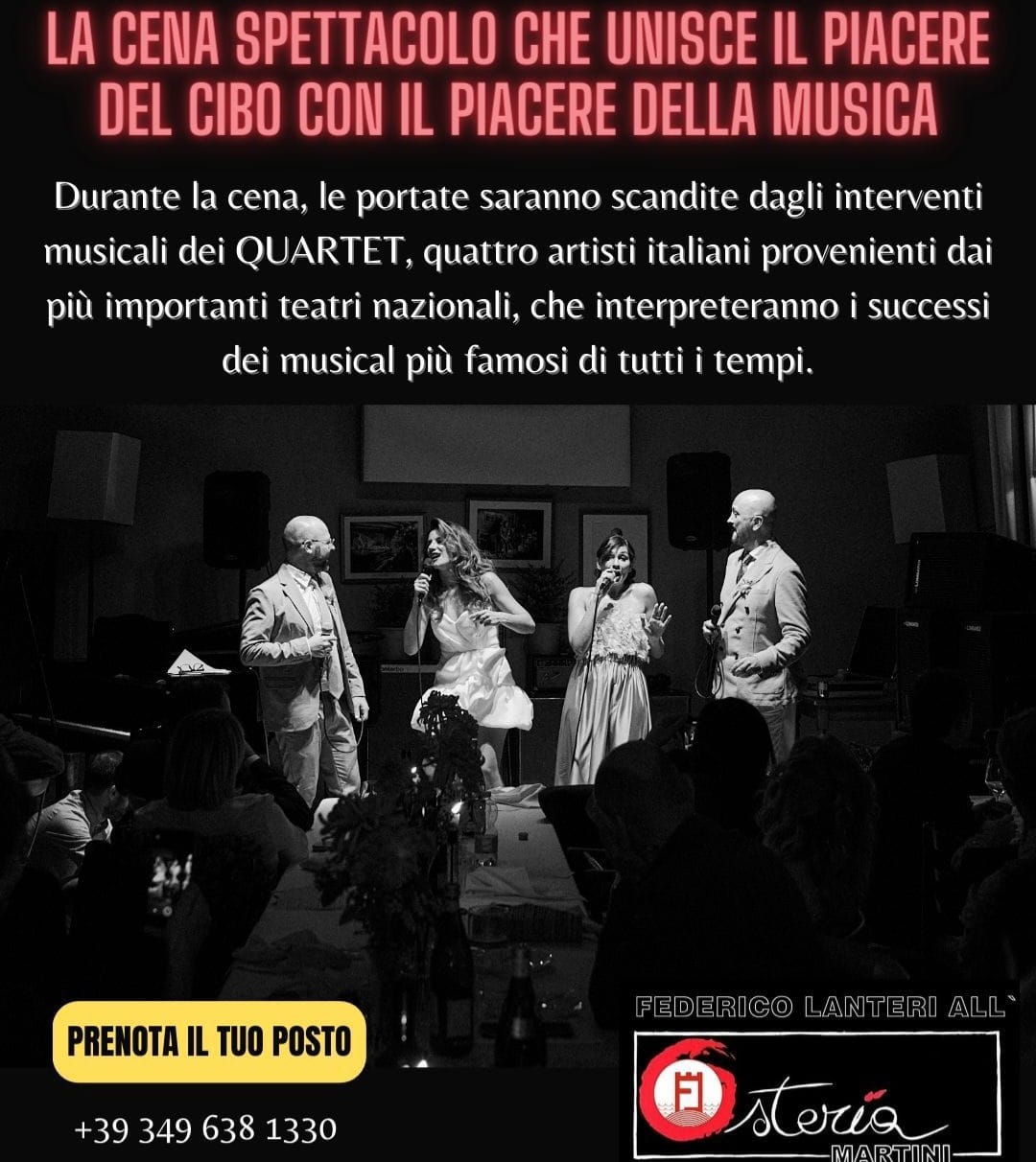 L'atmosfera incantevole dell'Osteria Martini, unita alla maestria culinaria dello chef e alle performance musicali dei Quartet, renderà questa serata un'esperienza indimenticabile.