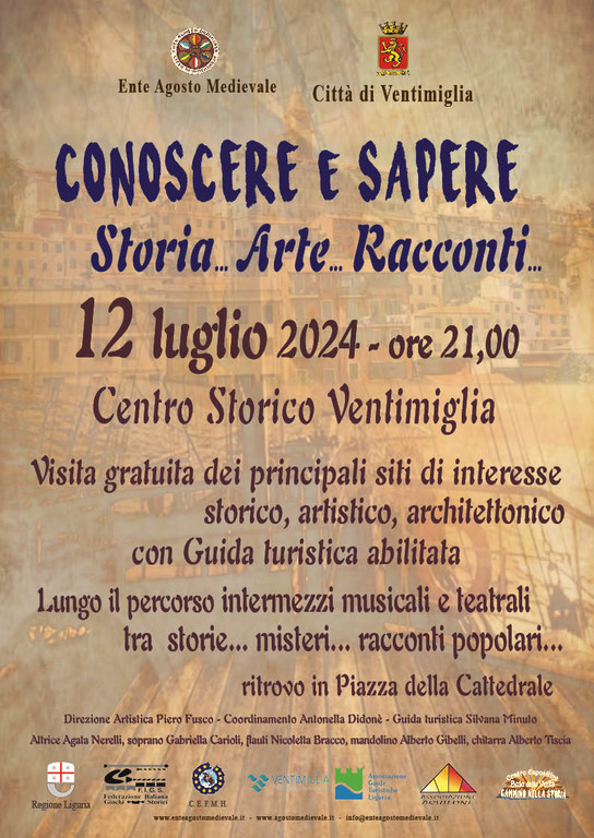 “L’Ente Agosto Medievale, in collaborazione con il Centro Espositivo Sala delle Volte – spiega il presidente Piero Fusco -, continua il progetto Culturale ‘Conoscere e Sapere’, Storia… Arte… Racconti… legato alla promozione e valorizzazione del patrimonio Storico, Artistico e al mantenimento delle straordinarie tradizioni che Ventimiglia possiede.