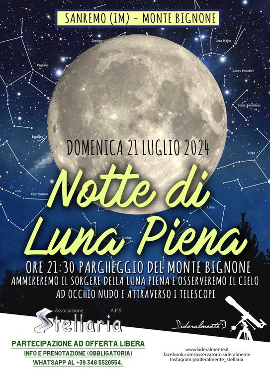 Domenica 21 luglio a Monte Bignone, sulle alture di Sanremo, una serata dedicata all'osservazione della maestosa Luna Piena e del cielo stellato. L'incantevole scenario che sovrasta la città dei fiori, con la sua ampia vista panoramica, creerà la cornice perfetta per ammirare il sorgere della Luna Piena e ammirare la notte illuminata dalla sua luce.