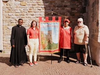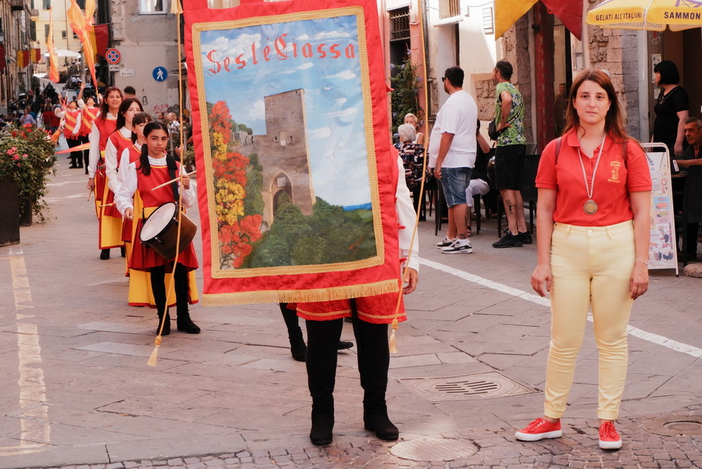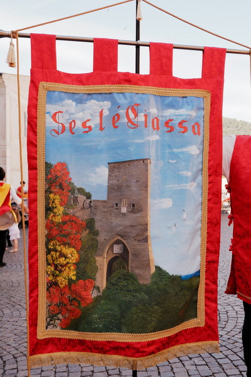 Il gonfalone ha fatto la sua prima apparizione in corteo lungo via Garibaldi, guidando i Musici e gli Sbandieratori in piazza della Cattedrale, dove hanno intrattenuto il pubblico presente con alcune delle loro esibizioni. Al termine, è stato benedetto da Don Gerad, parroco della Cattedrale, che si è dimostrato molto disponibile e curioso di conoscere la storia e le tradizioni dei Sestieri.