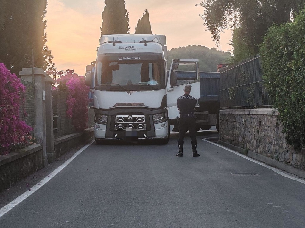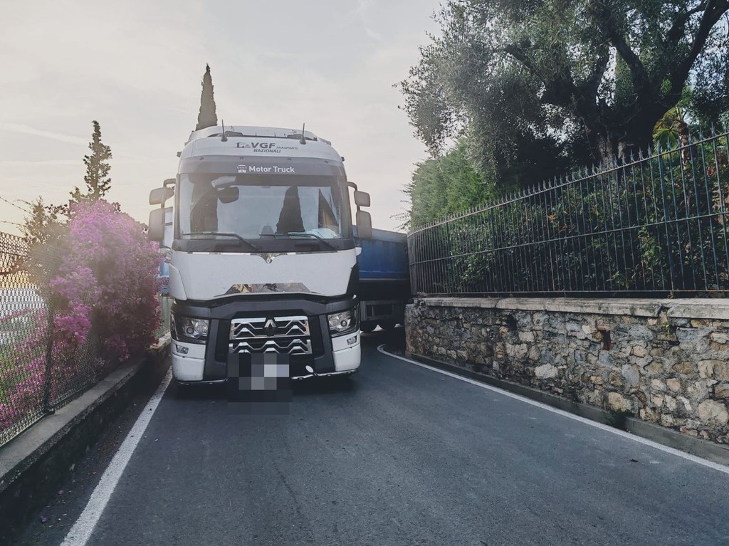 Bordighera, tir incastrato in via Coggiola: oltre 5 ore di intervento, traffico in tilt (Foto)