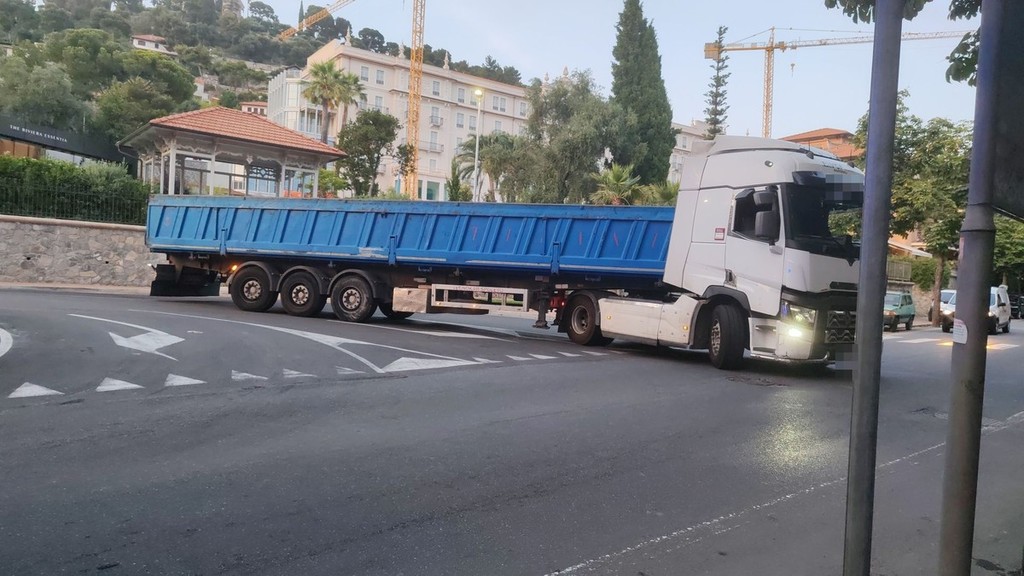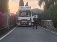 Riaperta via Coggiola a Bordighera. I vigili del fuoco solo grazie a un'autogru sono riusciti a liberare il camion che si era incastrato in un tornante scendendo dall'autostrada quasi ormai sette ore fa.