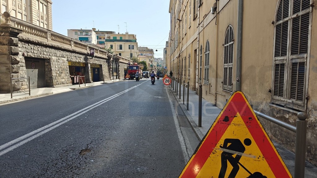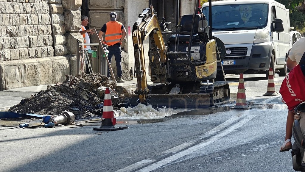 Intervento urgente di Rivieracqua, questa mattina in via Volta a Sanremo per la rottura di una tubazione, all’altezza delle scuole e del parcheggio interrato.