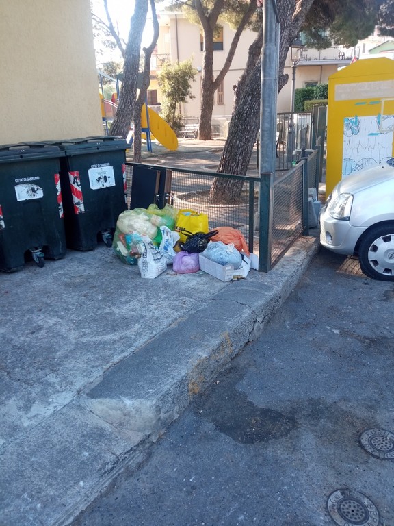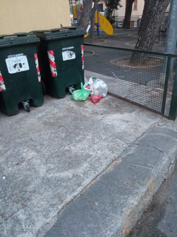 È dal 26 luglio che ogni giorno attraverso la documentazione fotografica mando all'Urp di Sanremo le fotografie fatte con lo smartphone a dimostrazione del fatto che ci sono abitanti della frazione (pochissimi in verità) che, ignoti agli uffici per la riscossione della Tari, abbandonano ogni giorno (o di sera, quando transitano meno persone) non solo la pattumiera organica ma anche tutta una serie di avanzi che andrebbero differenziati e posti nei giusti sacchi e con il sistema porta a porta rimossi nei giorni indicati dal personale dipendente di Amaie energia su incarico del Comune di Sanremo.