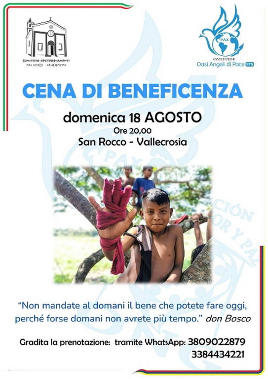 Oggi, domenica 18 agosto, alle ore 20, presso il piazzale/campetto della parrocchia di San Rocco a Vallecrosia, si terrà una cena di beneficenza organizzata a favore dell'Associazione Oasi Angeli di Pace ETS.