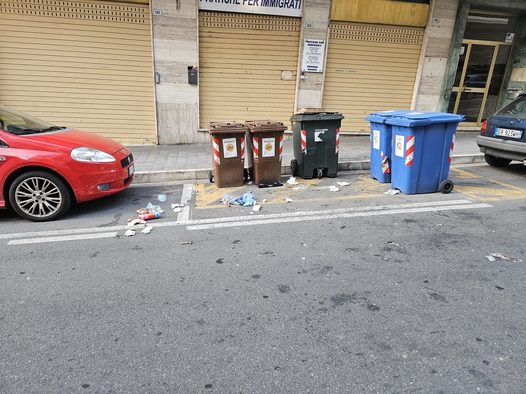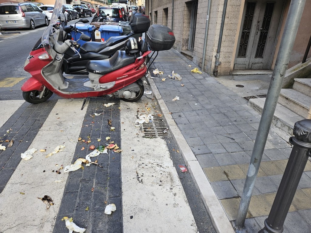 Via Martiri piena di rifiuti. Le foto sono state inviate da un lettore, il quale ci segnala lo stato di una delle principali arterie della città alle 8 del mattino: "Ecco il biglietto da visita di Sanremo", il commento.
