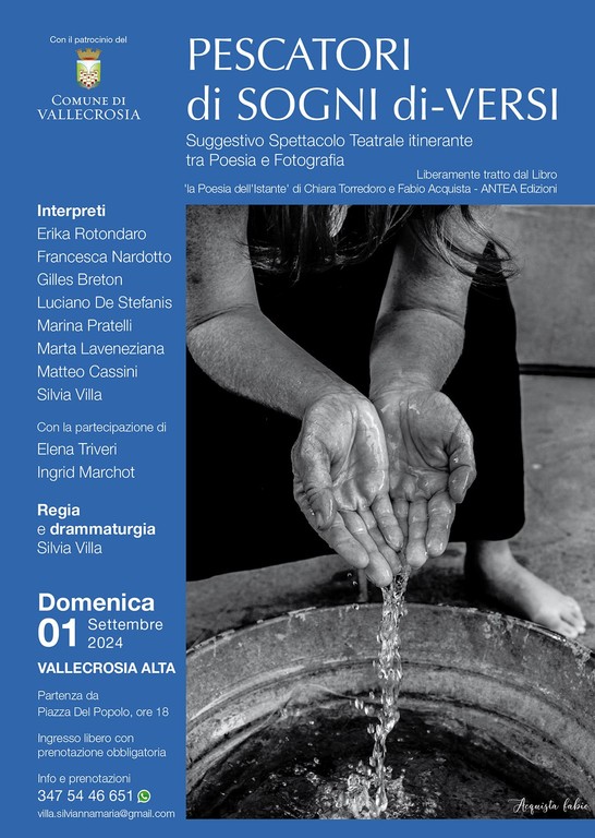 Lo spettacolo, che è liberamente tratto da “La Poesia dell’Istante” di Chiara Torredoro e Fabio Acquista, durerà un'ora e 15 minuti circa e partirà in piazza del Popolo. "Dopo il successo dell’anno scorso a Vallebona, arriva anche nel meraviglioso borgo di Vallecrosia Alta 'Pescatori di Sogni di-Versi', un originale spettacolo teatrale itinerante tra emozionanti versi poetici ed evocative immagini fotografiche, nato per suggerire domande sull’affascinante e complesso 'Gioco della Vita'" - fa sapere Silvia Villa, regista e attrice, che ha curato l'ideazione, la regia e la drammaturgia dello spettacolo - "Un onirico viaggio dentro l’uomo e le sue molteplici possibilità di 'abitare il mondo', in compagnia di Sibille incantatrici, inesperti giocolieri e creature 'sospese' alla ricerca di 'Sè', che a tratti interagiranno direttamente con il pubblico, rendendolo parte integrante dello spettacolo. Si navigherà verso le insondabili terre dell’animo umano tra teatro, poesia e fotografia, nei luoghi più suggestivi del centro storico di Vallecrosia Alta. L'ingresso è libero ma la prenotazione è obbligatoria contattando il 347 5446651 o scrivendo a villa.silviannamaria@gmail.com".
