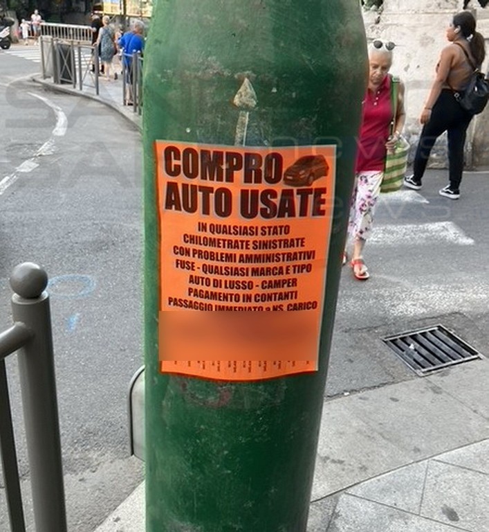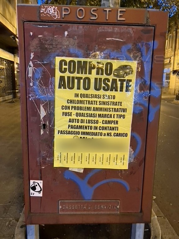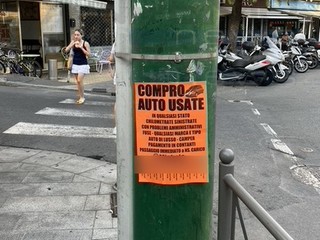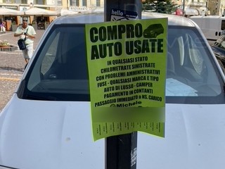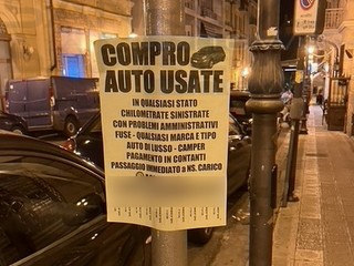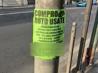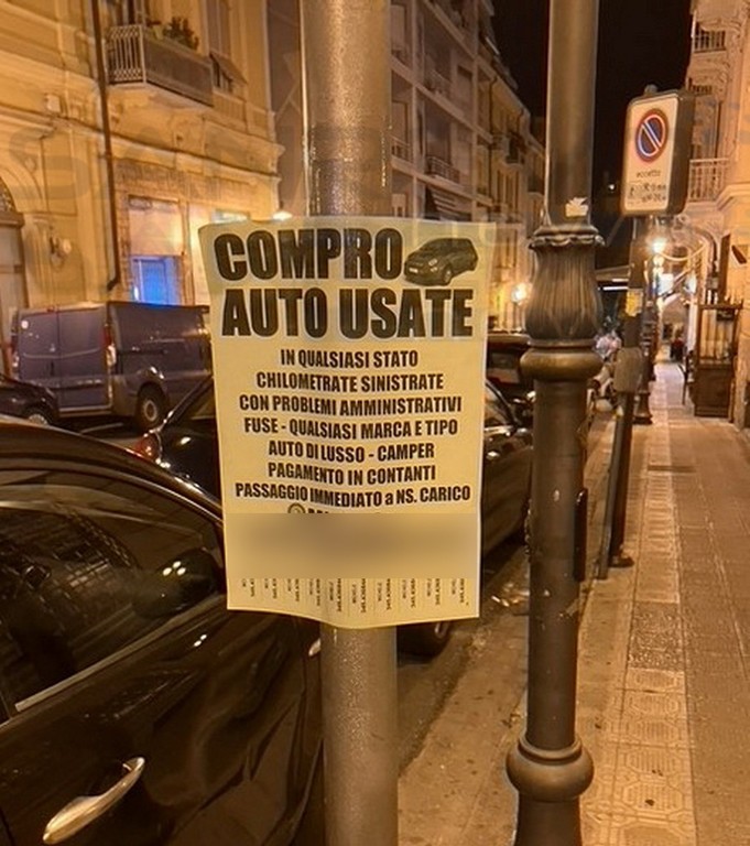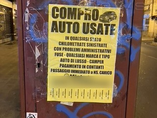 I cartelli sono dei semplici fogli colorati dove un certo ‘Michele’ si dichiara disponibile ad acquistare auto in qualsiasi stato e di qualsiasi marca con pagamento in contanti