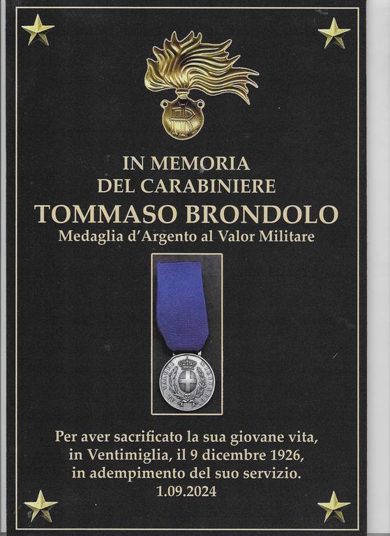Ventimiglia dedica una targa alla memoria del carabiniere Tommaso Brondolo, che, il 9 dicembre del 1926 nella stazione della città di confine, sacrificò la sua giovane vita nell’adempimento del suo servizio. La cerimonia si terrà domenica prossima, il 1° settembre, nel parco verde degli alpini ventimigliesi di Sant'Antunin a Trucco, frazione di Ventimiglia, in occasione del 26esimo raduno alpino intemelio.
