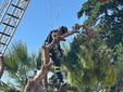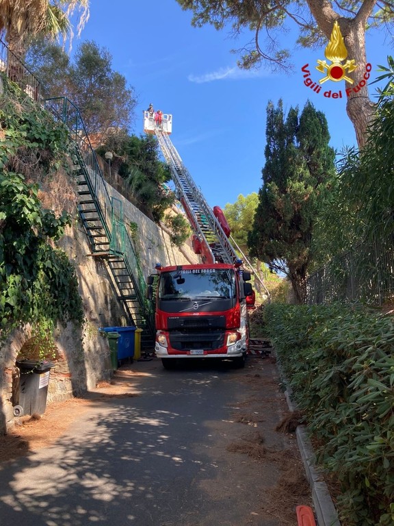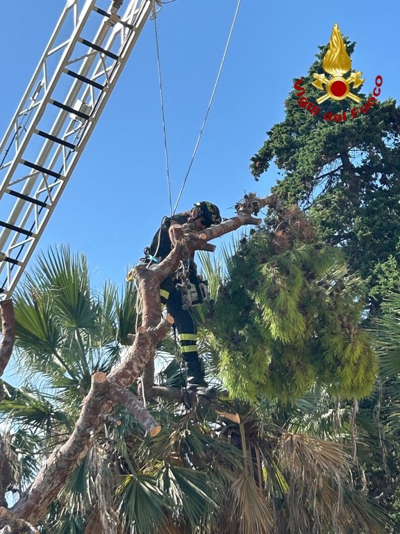 L'intervento, ancora in corso, si è reso necessario a causa della caduta di un grosso albero che, crollando, si è appoggiato su un muro di contenimento di un condominio, gravando pericolosamente sulla strada sottostante e sulla piscina condominiale