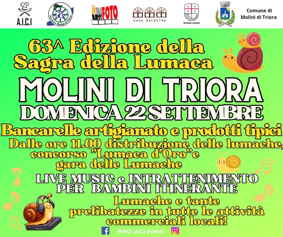 La Sagra della lumaca di Molini di Triora è stata rinviata a domenica 22 settembre a causa delle previsioni di maltempo. La festa, giunta alla sua 63ª edizione, si terrà quindi tra tre domeniche nel suggestivo borgo dell'entroterra ligure, con un programma ricco di eventi e attrazioni per tutte le età.