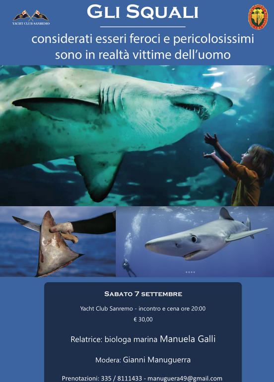 Lo Yacht Club Sanremo e la Famija Sanremasca hanno ospitato sabato 7 settembre la Biologa marina e docente Manuela Galli ad una cena-conferenza con argomento 'Gli Squali - considerati esseri feroci e pericolosissimo sono in realtà vittime dell’uomo'.