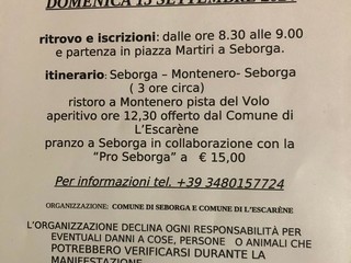 L'evento è organizzato dal comune di Seborga insieme a quello di L'Escarène. "Il ritrovo sarà alle 8.30 mentre la partenza sarà alle 9 da piazza Martiri a Seborga" - dicono gli organizzatori - "L'itinerario di circa tre ore prevede un ristoro a Montenero, sulla pista del volo. Alle 12.30 vi sarà un aperitivo offerto dal comune di L'Escarène mentre il pranzo sarà a Seborga in collaborazione con la Pro Seborga".
