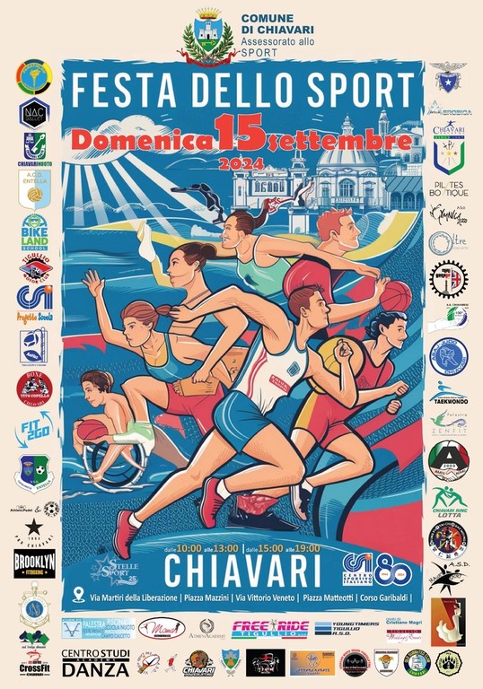 Queste le 48 associazioni dilettantistiche coinvolte: ASAJ judo Chiavari, Tigullio Motor Club, Panathlon Tigullio Chiavari, Aerobica Entella, Athletic calcio A5, Subbuteo Club Chiavari, Yougtimer Tigullio asd, Tennis Chiavari, Aurora Basket, Gymnica 2000, Polisportiva Acquarone, Athena academy Chiavari Power Lifting ACD, AB Chiavari Bocce, Scherma Chiavari, Anfass, Momas, Free ride Tigullio Asd, Bikeland Shool Asd, White Shark Powerlifting, Zen Fit, Centro Studi Danza Academy asd, Sankaku Karate, Mini Garage Genova, Spazio Oltre ASD, Progetto Scuola CSI, Chiavari Nuoto SSD, A.S.D. Chiavari Ring Lotta, ASD Bridge Chiavari, Benzena ASD, Cosmosportacademy SSD (Studio Pilates Chiavari), 2Be Staff CrossFit, Brooklyn Fitboxing Chiavari, Cai Chiavari, Fit2go asd, Orsi del Tigullio ASD, U.S.D. Calcio Caperanese Entella, Pugilistica Tito Copello, ACD Entella, Villaggio Sport sez TT asd, Chiavari ASD, Pro Chiavari, Polisportiva Athletic Tigullio A.S.D., A.S.D. Maury Sport, NAC Ballet, Vbc Amis Chiavari, Open Arts ASD, TaiChi & KingFu Chiavari, Lega Navale Chiavari.