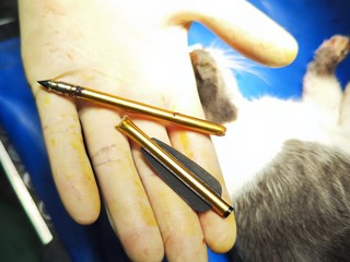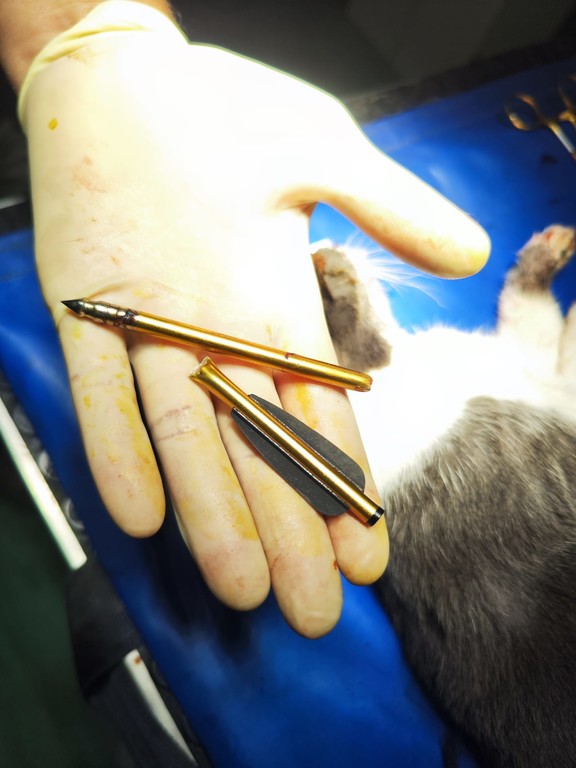 Soccorso da polizia e Ambulanze Veterinarie Odv un gatto trafitto da una freccia di balestra. E' successo ieri a Ventimiglia.