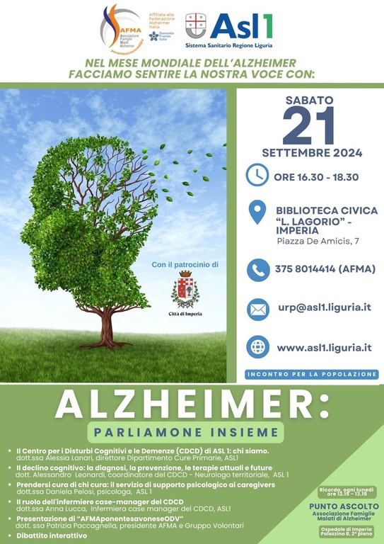 L'appuntamento, patrocinato dal comune di Imperia, sarà sabato 21 settembre, dalle ore 16.30 alle 18.30, presso la Biblioteca Civica "Lagorio" di Imperia (piazza De Amicis, 7). L'incontro, rivolto a tutta la cittadinanza ed in particolare a chi assiste e si prende cura di malati di Alzheimer, fornirà informazioni sulla patologia e soprattutto sui servizi che sono a disposizione e a supporto delle famiglie, e sarà una occasione preziosa per discuterne insieme.