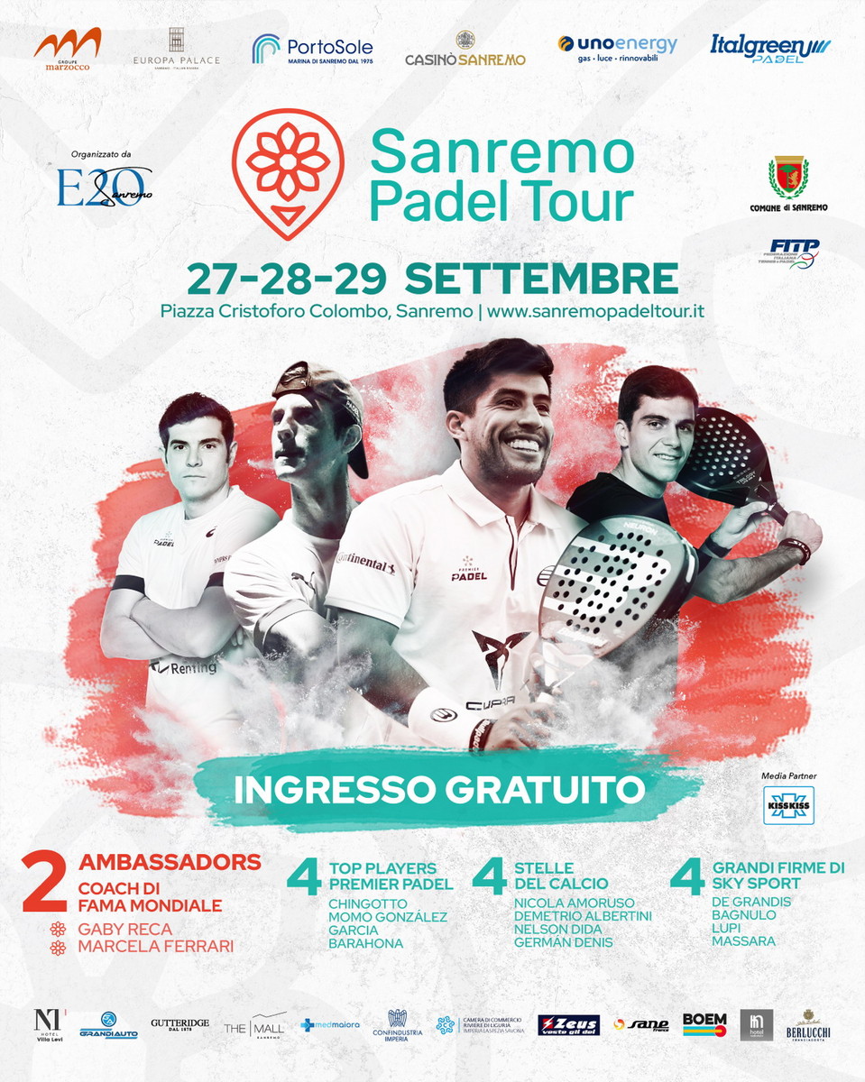 Il Sanremo Padel Tour (evento organizzato da 'E20 Sanremo' con il patrocinio del Comune e il sostegno del Tavolo del Turismo, Casinò di Sanremo, della Camera di Commercio delle Riviere Ligure e di Confindustria Imperia) andrà in scena dal 27 al 29 settembre in piazza Colombo, dove sarà montato un campo con tribune per chiunque vorrà assistere gratuitamente allo show delle grandi star del padel e dello sport. Un appuntamento presentato oggi a Palazzo Bellevue dall'organizzatore Fulvio Gazzola, grande appassionato di padel, AD di ‘E20 Sanremo' e noto a tutti in qualità di sindaco di Dolceacqua, con la partecipazione dell'assessore al Turismo e Sport, Alessandro Sindoni.