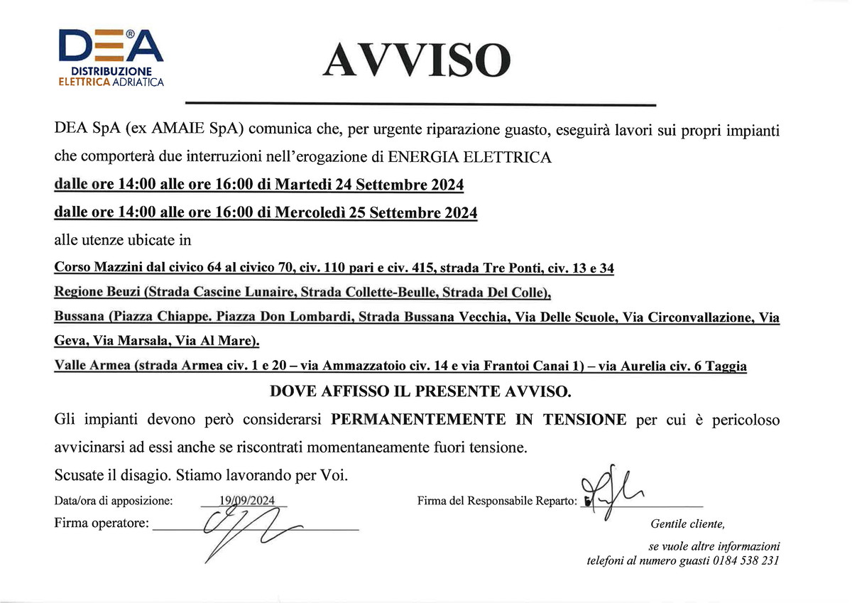 A causa di una urgente riparazione di un guasto, Dea Spa (ex Amaie) eseguirà una serie di lavori sui propri impianti che comporterà due interruzioni nell’erogazione dell’energia elettrica.