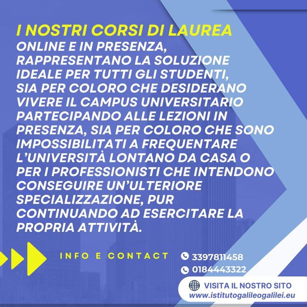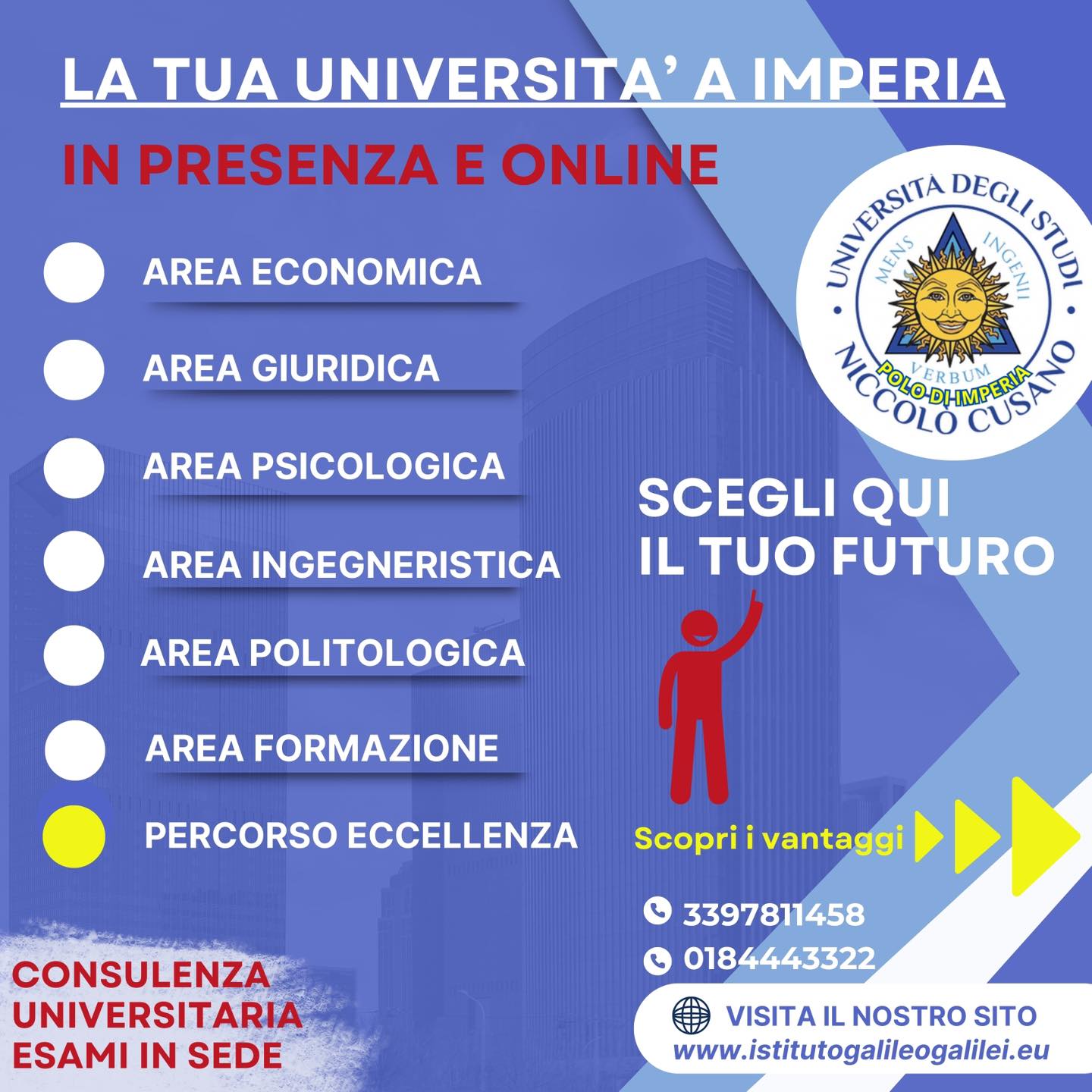 Realizza i tuoi sogni, scegli l'Università Niccolò Cusano! Per ulteriori informazioni puoi recarti direttamente all'Istituto G.Galilei ad Arma di Taggia, in via Stazione 6, oppure chiamare in Segreteria allo 0184 42233 e 3499736785, visitare il Sito o scrivere una mail: imperia@unicusano.it / istitutoggalilei@yahoo.it, referente dott.ssa Barbara Buscaglia ( tel. 339/7811458).