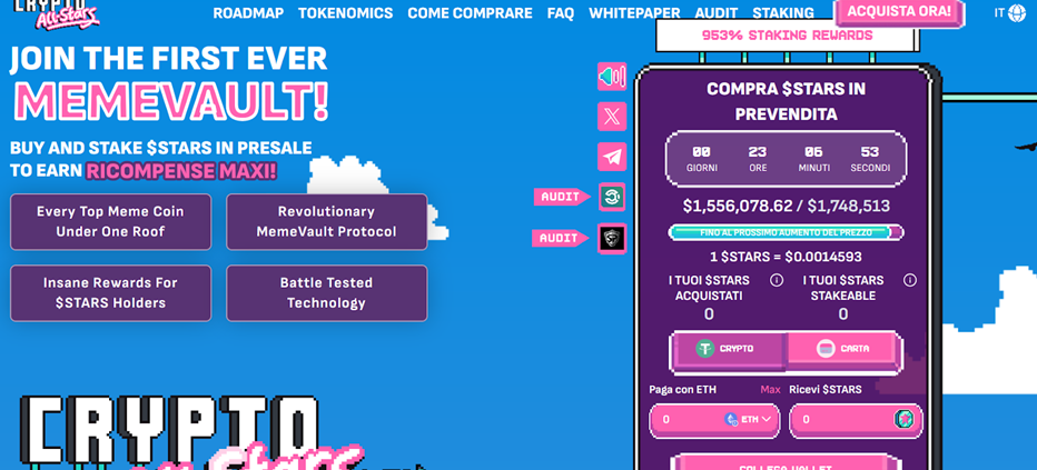 Dopo NEIRO, anche STARS, il token nativo del nuovo progetto Crypto All-Stars, potrebbe puntare proprio al listing su uno scambio così importante, forte della sua piattaforma MemeVault, che permette ai suoi investitori di guadagnare tramite lo staking delle meme coin, ottimizzando gli introiti.