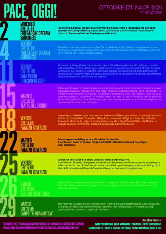La manifestazione ‘Ottobre di Pace’, nata dalla proclamazione di Sanremo ‘Città Internazionale per la pace, la nonviolenza e i diritti umani’, è arrivata alla sua diciannovesima edizione per portare anche quest’anno il suo contributo alla diffusione della cultura della pace e della nonviolenza.