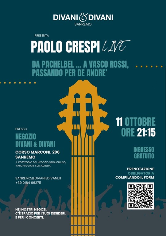 Appuntamento quindi a venerdì 11 ottobre, ore 21.15 (l’accesso nello showroom sarà possibile dalle ore 20.45) a Sanremo, in Corso Marconi 296 (il posteggio del negozio sarà chiuso, a quanti interessati si consiglia di parcheggiare sull’Aurelia) per ascoltare “Da Pachelbel … a Vasco Rossi, passando per De Andrè”, Paolo Crespi live.