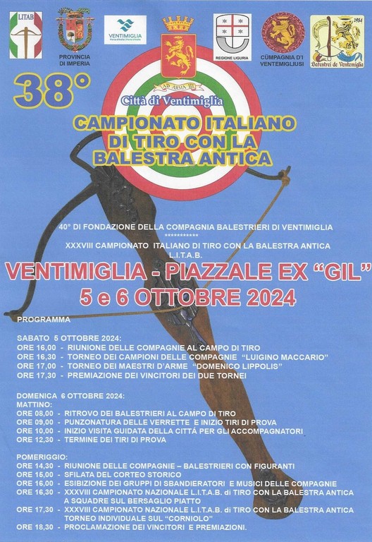 Una due giorni interamente dedicata alla riscoperta della pratica della 'balestra antica da banco'. "La compagnia ha già organizzato dei campionati nazionali a Ventimiglia" - sottolinea Canavese - "Nel 1988 a Ventimiglia, nel 1992 ad Imperia, nell’ambito delle celebrazioni colombiane, nel 2011 a Ventimiglia e quest'anno organizzerà, nel mese di ottobre, nel piazzale della palestra ex Gil di via Chiappori a Ventimiglia il 38° campionato italiano".