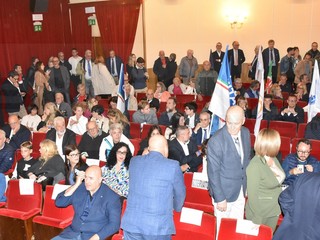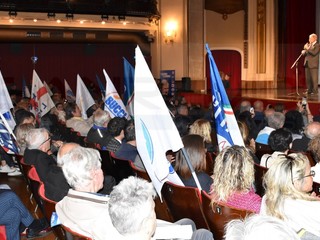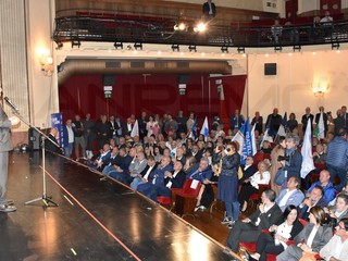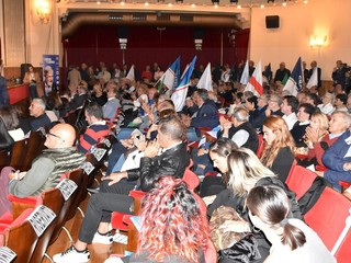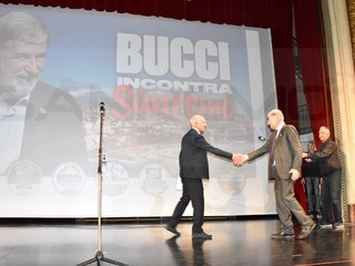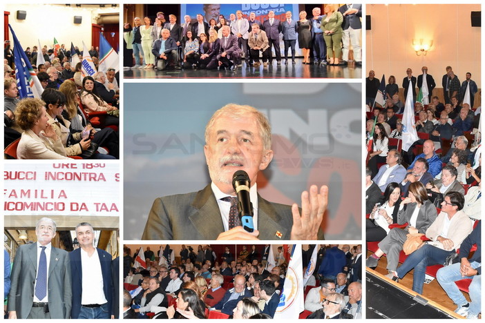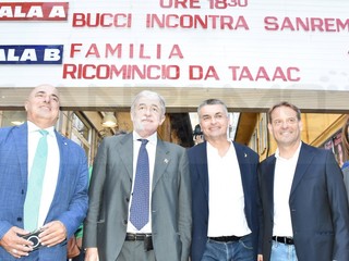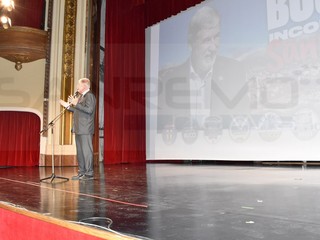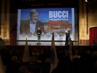 Teatro Centrale pieno ad accogliere il sindaco di Genova. Dopo le tappe nel corso delle giornata in tutta la provincia Bucci è arrivato a Sanremo per incontrare la cittadinanza.