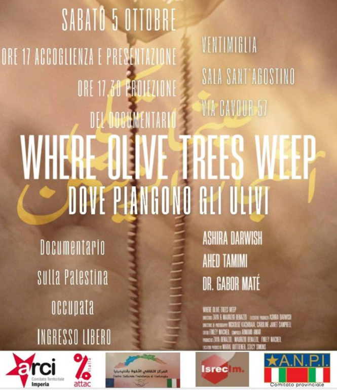 Per l'occasione sarà proiettato il docufilm “Dove piangono gli ulivi”: un documentario che si sposta nei territori palestinesi occupati, raccoglie le voci di israeliani e palestinesi impegnati per la giustizia e la libertà condivise, riporta le testimonianze di donne e uomini palestinesi nelle carceri israeliane. Dopo la proiezione sarà aperto il dibattito. Interverranno rappresentanti delle associazioni organizzatrici, tra cui Kalid Rawash, medico palestinese-italiano, il presidente provinciale dell’ARCI e l’imperiese Susanna Bernoldi dell’AIFO, attivista sociale e umanitaria internazionale che porterà le testimonianze dirette dei suoi numerosi viaggi in Palestina. L’incontro sarà anche un’ulteriore occasione per rilanciare la campagna di boicottaggio BDS (Boicottaggio Disinvestimento Sanzioni) contro l’occupazione e l’apartheid israeliana, per la parità dei diritti per tutte e tutti, contro ogni forma di discriminazione.