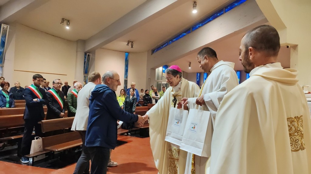 Alla fine della funzione religiosa e dopo aver recitato la preghiera per la pace di San Francesco, il vescovo Marino ha, inoltre, consegnato un pensiero, una tavola in legno che raffigura il simbolo del giubileo, al sindaco di Vallecrosia e candidato alla carica di consigliere regionale Armando Biasi, presente insieme al vicesindaco Marilena Piardi, all'assessore Patrizia Biancheri e ai consiglieri comunali Enrico Amalberto e Fabio Perri; al sindaco di San Biagio della Cima Simone Rotolo; al sindaco di Soldano Antonio Fimmanò; al sindaco di Perinaldo Francesco Guglielmi; ai carabinieri di Vallecrosia; ai carabinieri di Perinaldo; agli alpini; alla Ponente emergenza protezione civile odv di Vallecrosia; alla Croce Azzurra Misericordia di Vallecrosia; al coro Troubar Clair e ai parroci delle parrocchie della val Verbone (don Rito, don Karim, don Emilio e don Rosario). Al vescovo di Savona-Noli, Calogero Marino, è stata, invece, consegnata una tavola in legno con un'immagine che raffigura pellegrini in cammino verso il Giubileo.