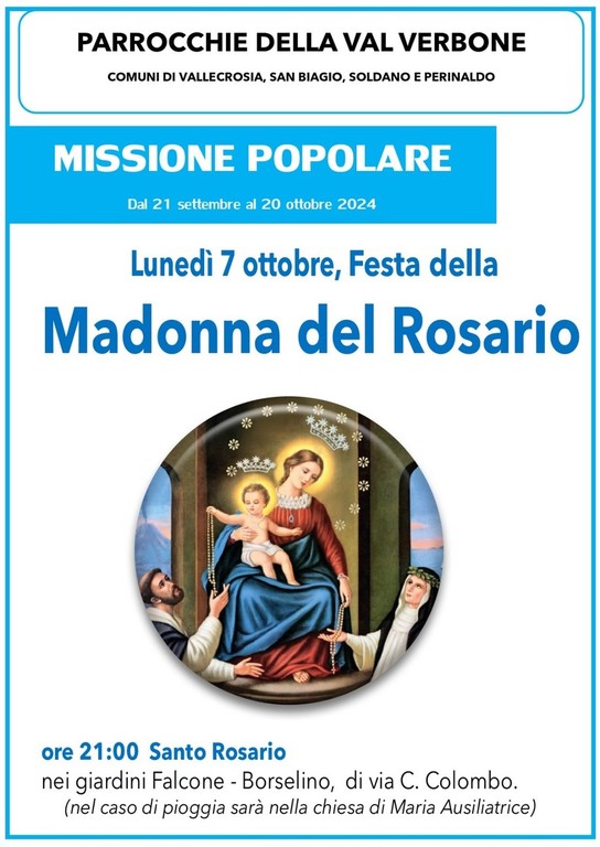 A Vallecrosia la 'Missione popolare' sul territorio in attesa del Giubileo, che coinvolge le parrocchie della val Verbone, prosegue domani, lunedì 7 ottobre, alle 21 con la festa della Madonna del Rosario.