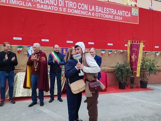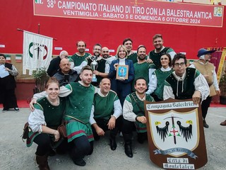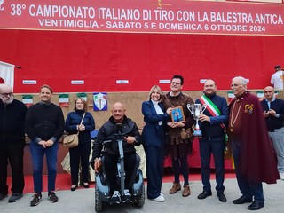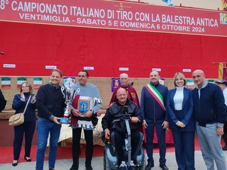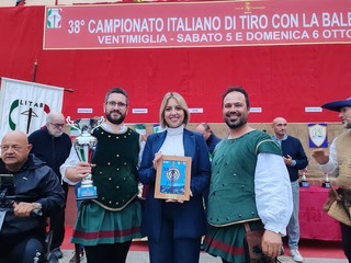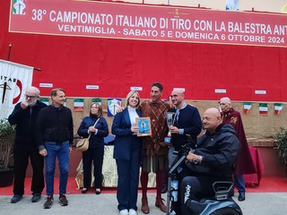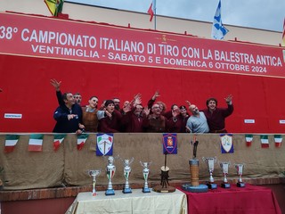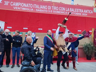 E' stata una successo la due giorni interamente dedicata alla riscoperta della pratica della 'balestra antica da banco', organizzata dalla Compagnia Balestrieri di Ventimiglia nel quarantennale della storia della sua fondazione, che ha visto la partecipazione di oltre 200 balestrieri. Alla conclusione delle gare si sono svolte le premiazioni alla presenza dell'Amministrazione comunale di Ventimiglia, dell'assessore regionale Marco Scajola e dei cittadini. Graziella Baduino ha consegnato la 'Coppa Memorial Luigino Maccario' al balestriere più giovane del campionato: Nicholas Bossi della compagnia San Paolino di Lucca. Il sindaco Flavio Di Muro ha consegnato il 'Trofeo Città di Ventimiglia' al vincitore del torneo a squadre: la compagnia San Paolino di Lucca. Sul podio anche Terra del Sole e Montefalco, rispettivamente secondi e terzi. L'assessore regionale Marco Scajola, invece, ha consegnato il 'Trofeo Regione Liguria' al vincitore del torneo individuale: Mauro Elisei di Norcia. Sul podio anche Gianni Cecchinato e Rossano Cecchinato, entrambi di Chioggia, che si sono piazzati rispettivamente secondo e terzo.