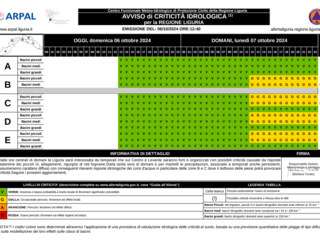 L’avviso meteorologico emesso oggi si può trovare su https://www.arpal.liguria.it/images/pdfWS/vigilanza.pdf. Nelle immagini, invece, si può vedere la cartina con le zone coinvolte nell’allerta e la scansione oraria. La sala operativa regionale resterà aperta per tutta la durata dell’allerta. In caso di eventi intensi, durante l’allerta sarà pubblicato il monitoraggio sul sito https://allertaliguria.regione.liguria.it Sul sito omirl.regione.liguria.it o sulla app meteo3r è possibile seguire l'evoluzione meteo attraverso le immagini radar e gli altri strumenti messi a disposizione di tutti.