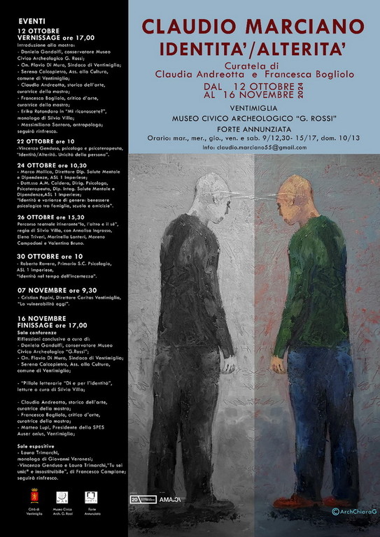 Il Museo Civico Archeologico “Girolamo Rossi” ospita a partire dal 12 ottobre la mostra ”Identità / Alterità” dell'artista Claudio Marciano, iniziativa con la quale il Museo ha aderito anche quest'anno alla Giornata del Contemporaneo, il grande evento che, dal 2005, l'Associazione dei Musei d’Arte Contemporanea Italiani (AMACI) dedica all’arte contemporanea e al suo pubblico, giunta quest'anno alla ventesima edizione. Il primo o il secondo fine settimana di ottobre i musei associati ad AMACI, accanto a tutte le istituzioni del nostro Paese che decidono di aderire all’iniziativa, aprono gratuitamente le loro porte per eventi, mostre, conferenze e laboratori. Un programma multiforme che regala l’imperdibile occasione di vivere da vicino la vivacità e la ricchezza dell’arte di oggi.