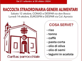 Una raccolta straordinaria di generi alimentari destinata ai poveri del territorio è stata organizzata dalle parrocchie San Rocco e Maria Ausiliatrice sabato scorso presso i supermercati di Vallecrosia. L'iniziativa solidale verrà riproposta anche oggi, lunedì 14 ottobre, all'Eurospin e al Despar.