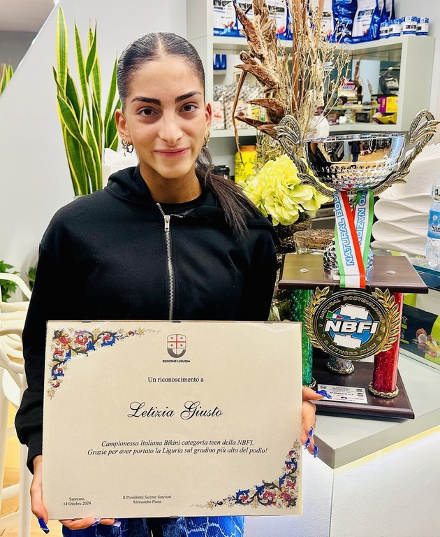 Il Presidente facente funzioni Alessandro Piana ieri ha premiato la neo campionessa italiana di body building Letizia Giusto. La giovane diciassettenne si è aggiudicata infatti la medaglia d’oro nella categoria "Bikini Teen" (16-19 anni), conquistando così il successo ai campionati italiani NBFI. Letizia è “figlia d’arte” del pluripremiato body builder Dennis Giusto, e della campionessa Rossella Pruneti, per anni collaboratrice di numerose riviste del settore, nonché addetta stampa della federazione mondiale.