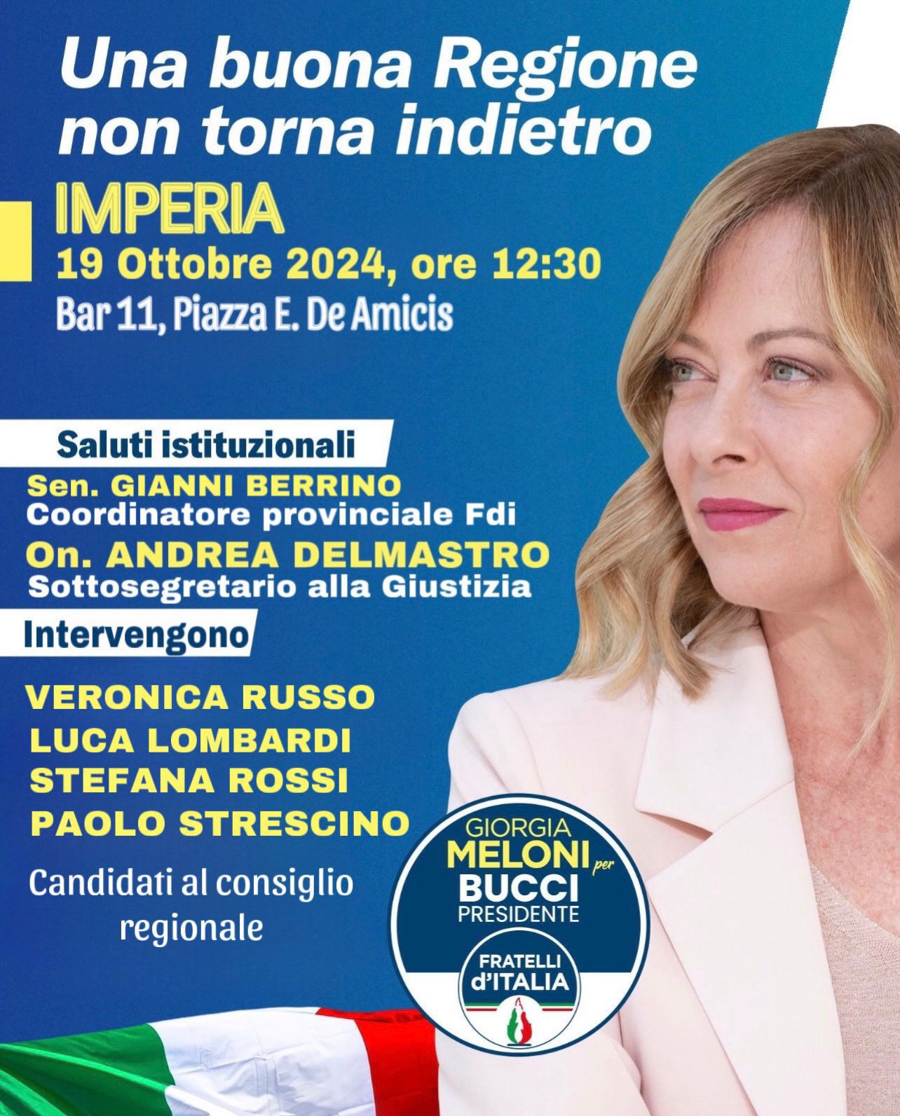 La giornata inizierà con una passeggiata nel centro di Oneglia e Calata Cuneo. A seguire, alle 12.30, ci sarà un punto stampa al ‘Bar 11’, dove saranno affrontati temi di attualità politica e di rilevanza territoriale. All’evento interverranno, oltre all’Onorevole Andrea Delmastro, il Senatore Gianni Berrino e i quattro candidati alle elezioni regionali per Fratelli d’Italia: Veronica Russo, Paolo Strescino, Luca Lombardi e Stefana Rossi.